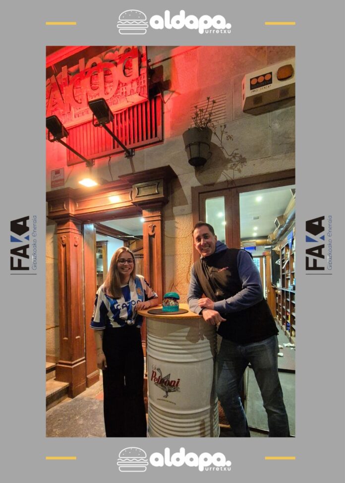 Además, en esta ocasión han querido completar la propuesta de una forma de lo más original. Siguiendo la temática de esta nueva propuesta, Aldapa sorteará dos entradas VIP para ver a la Real Sociedad en el Reale Arena, proporcionadas por Faka Energía. Ander Larreategui, propietario del establecimiento, lo explica: