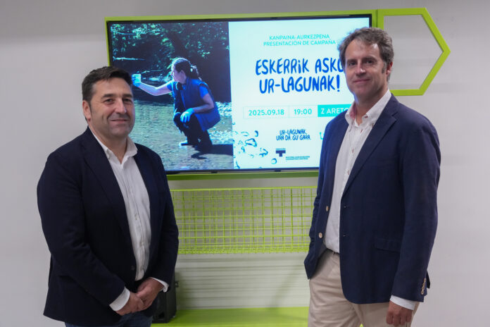 Josu Bilbao Eusko Jaurlaritzako Ingurumen sailburuordeak eta Asier López Etxebarria Uraren Euskal Agentziako zuzendari nagusiak «Eskerrik asko, Ur-lagunak» Uraren Euskal Agentziak sustatutako kanpaina aurkeztu dute gaur, 19:00etan, Donostiako Tabakalerako Z aretoan. Irailaren 22tik urriaren 3ra plazaratuko da.