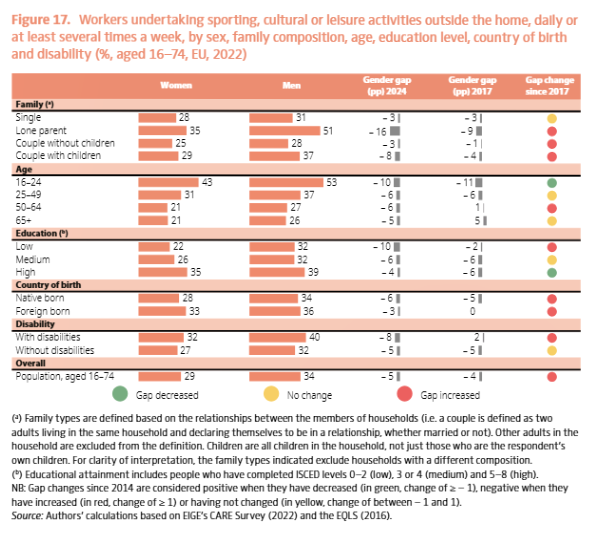 EIGEn adierazitakoaren arabera, Europako berdintasun-indizea % 71ekoa da (% 100 erabateko berdintasuntzat jotzen badugu), askotariko esparrutan (lana, agintea, dirua, ezagutzak, denbora eta osasuna) dauden desberdintasunen neurketak oinarri hartuta. Argi dago alderdi guzti horietan badagoela emakumeentzat kaltegarria den aldea, eta puntuaziorik txarrena lortu duen hirugarrena denbora da: % 68,5. Zaintzetan eta gizarte-jardueretan emandako denbora aztertu da. 2. irudian EIGEren dokumentuan jasota dagoen taula bat ageri da, aisialdiko jarduerak egiten dituzten emakume eta gizonen ehunekoari buruzkoa, askotariko aldagaiak kontuan izanik, hala nola familia-mota eta adina. Kategoria guztietan, emakumeen kopurua txikiagoa izan da. 2017ko eta 2024ko datuak ageri dira eta horien aldakuntza azken zutabearekin alderatu da; gorriz adierazi da zein kategoriatan egin duen txarrera arrakalak. Puntu gehienak gorriz. Nabarmentzekoa da areagotu dela bigarren lerroko (guraso bakarreko familiak) tartea, bai eta bederatzigarrena ere (hezkuntza-maila baxua).
