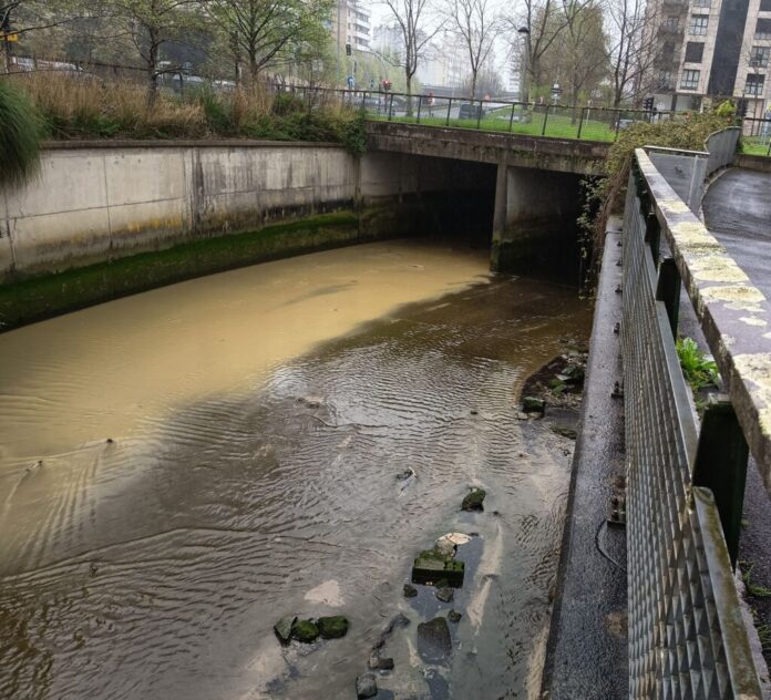 El colectivo ecologista Eguzki ha vuelto a dar la voz de alarma ante un nuevo episodio de contaminación en la regata de Añorga, en Donostia. Según informó la organización este lunes, se ha detectado un vertido de «masa opaca» que emana directamente de uno de los caños que afloran en la Avenida de Tolosa, a la altura del centro Nanogune. El contraste visual denunciado es evidente: mientras por una de las canalizaciones el agua fluye transparente, por la contigua desciende una densa mancha turbia que ensucia el cauce.